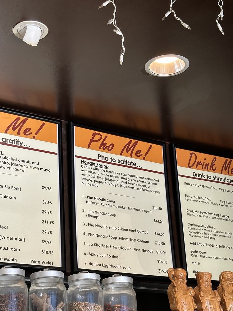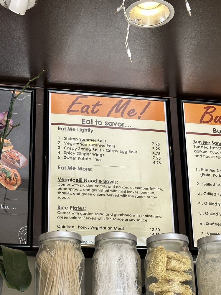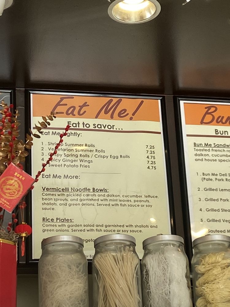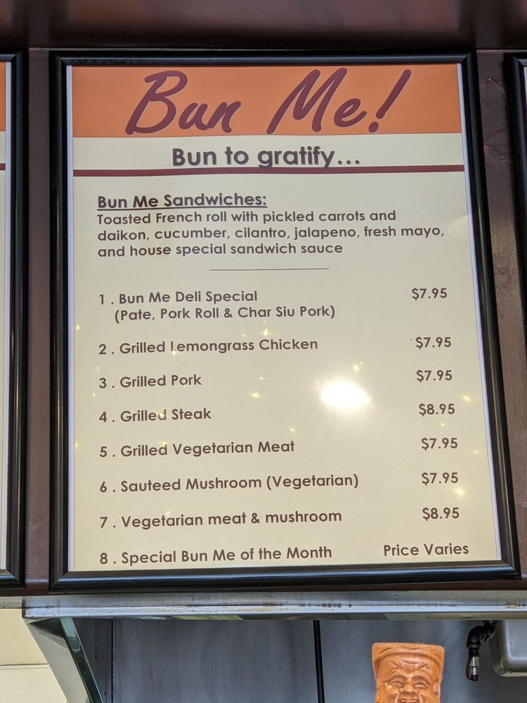 Introducing the menu at Bun Me!, a Vietnamese sandwich spot in Northridge, CA, with a focus on authentic and quality dishes. Standout items include the chicken and deli special sandwiches, praised for their fresh veggies, crispy bread, and juicy, flavorful meats. Customers rave about the bun bo hue soup infused with lemongrass and the hot, crispy wings. Vegetarian and vegan options, including top-rated tofu dishes like pho and banh mi, are a hit. The welcoming service, reasonable prices, and great boba add to the overall positive dining experience. With a cozy atmosphere and a menu that caters to different preferences, Bun Me! is hailed as a must-try for delicious Vietnamese fare.